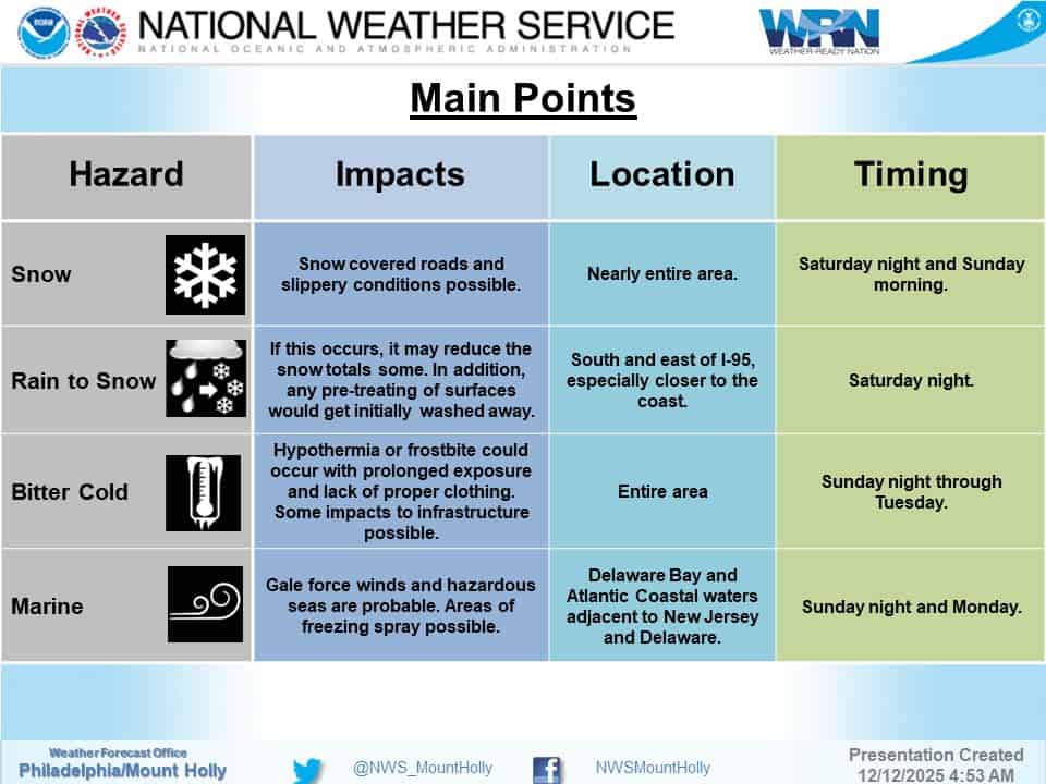The National Weather Service in Mount Holly says snow will begin late Saturday evening, with lighter bands developing between 9 p.m. and midnight. Steadier snow is expected after midnight, leading to quicker accumulation and potentially slippery roads early Sunday. Most of the area is forecast to see 1 to 4 inches by the time snow tapers off mid- to late morning. More snow is expected to fall in areas near Interstate 95.
