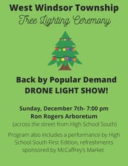 | West Windsor Township will hold the annual Christmas Tree Lighting at the Ron Rogers Arboretum at 7 p.m. followed by a drone show.