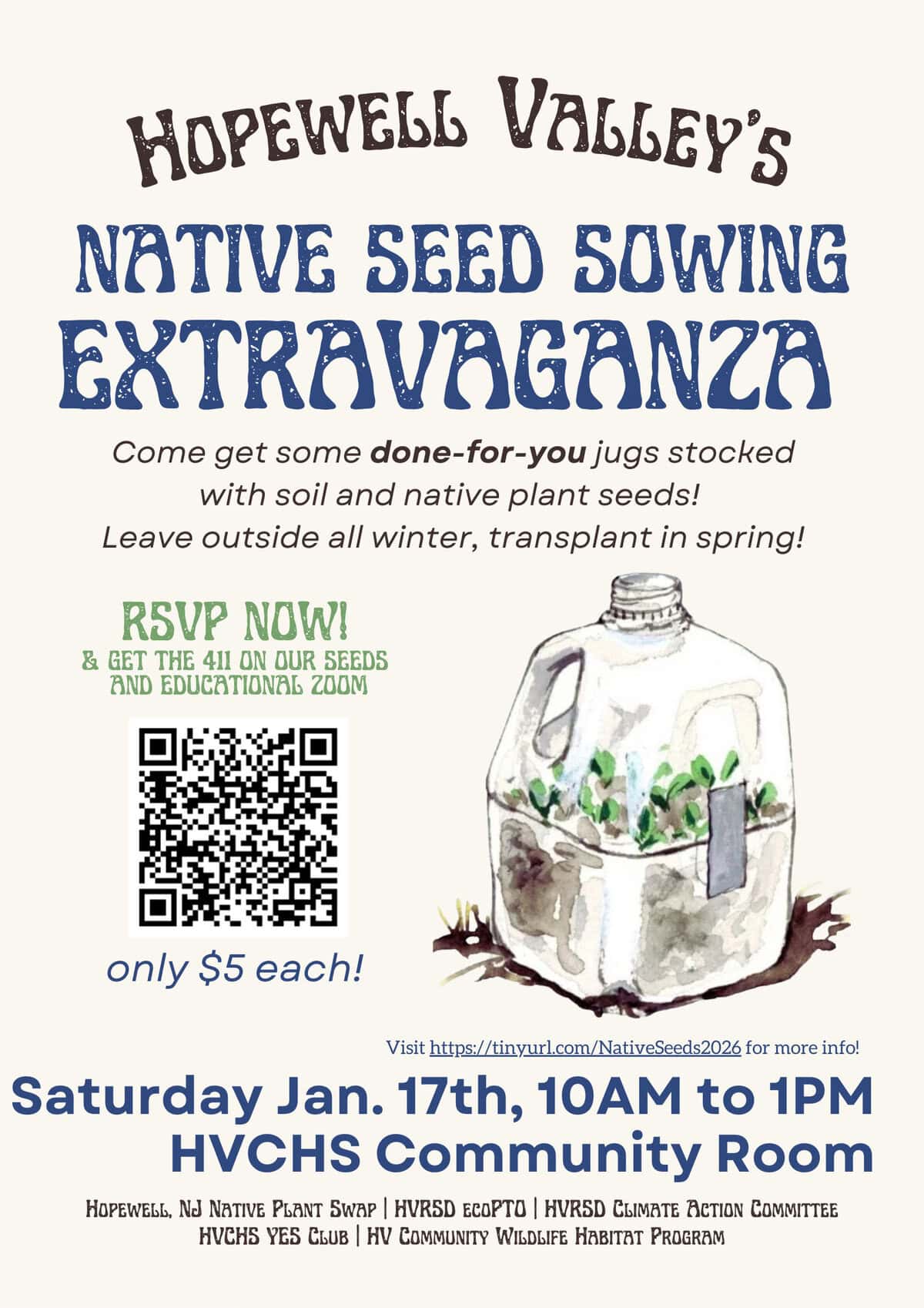 Hopewell Valley Central High School 259 Pennington Titusville Rd, Pennington$5 per ready-to-go greenhouse jugs loaded with seeds (grows ~10 native seedlings) Experienced volunteers will help you select seeds and prepare for success.
