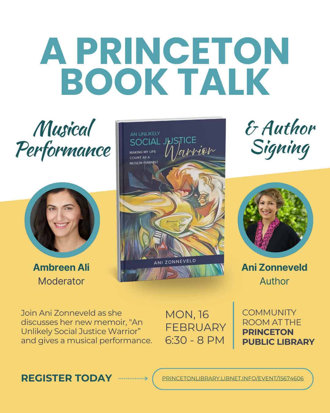 Princeton Public Library 65 Witherspoon Street, Princeton, NJ, United StatesAuthor, writer, singer/songwriter and speaker Ani Zonneveld discusses her new memoir, "An Unlikely Social Justice Warrior: Making my Life Count as a Muslim Feminist," with moderator Ambreen Ali. Musical performance and author signing to follow.